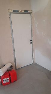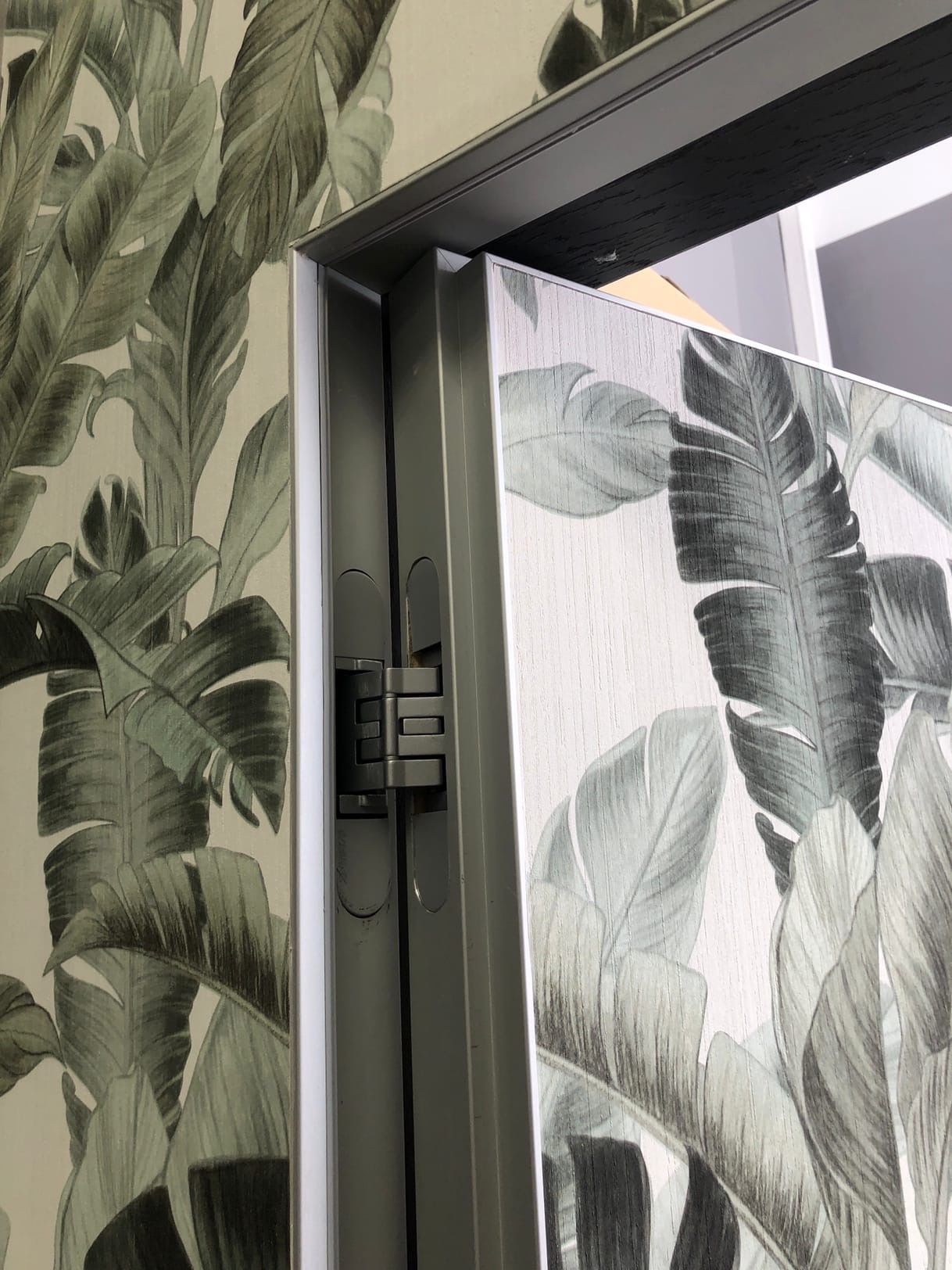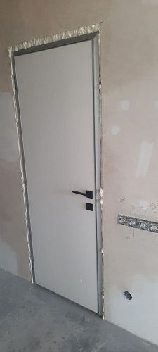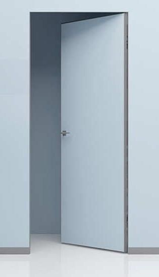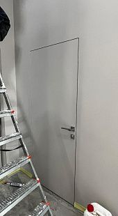 Дверь под покраску в скрытом коробе с алюминиевой кромкой. Система REVERSE - внутреннее открывание двери